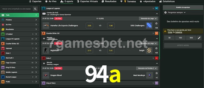 O 94a oferece uma grande seleção de opções de apostas em e-sports com probabilidades competitivas